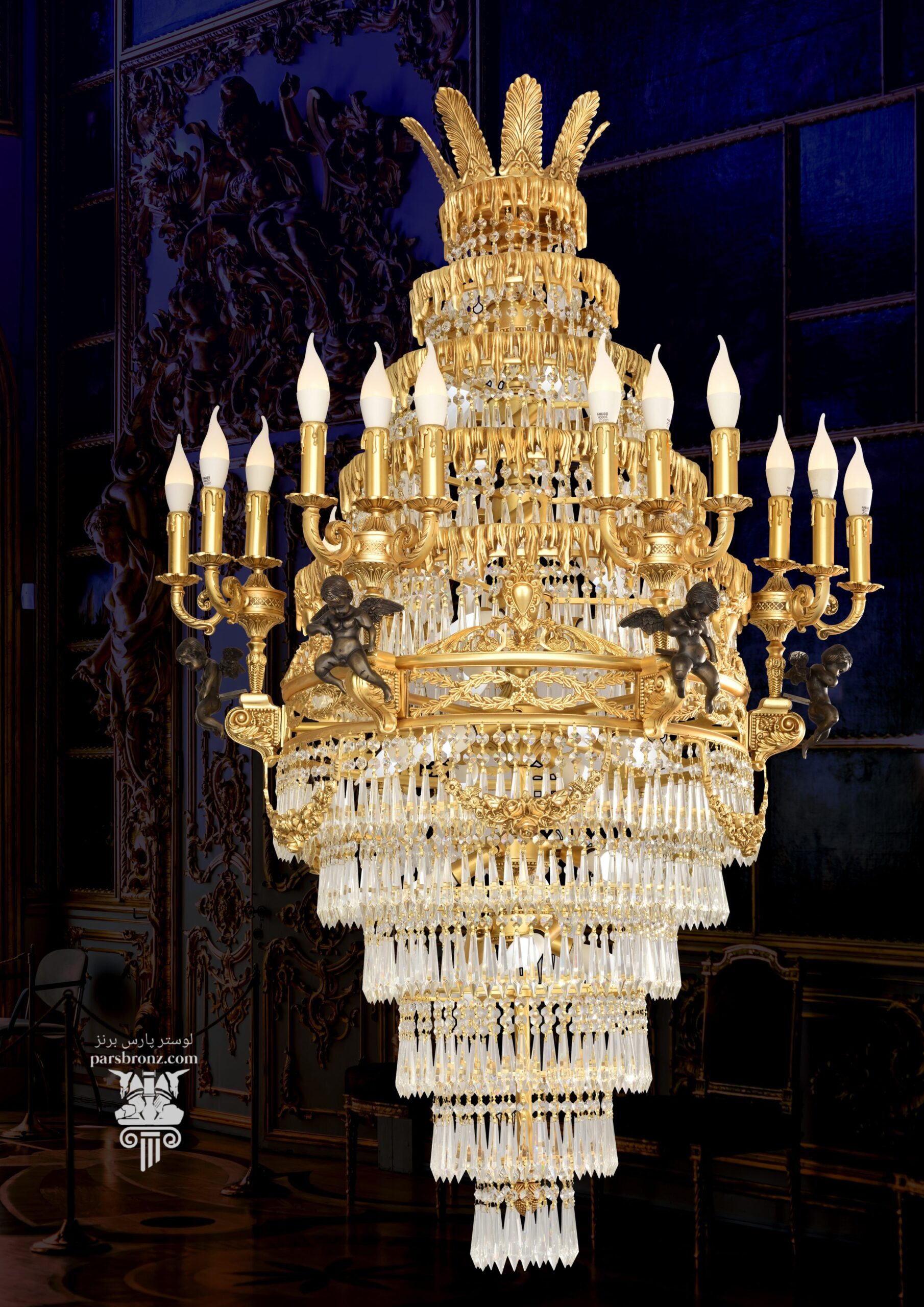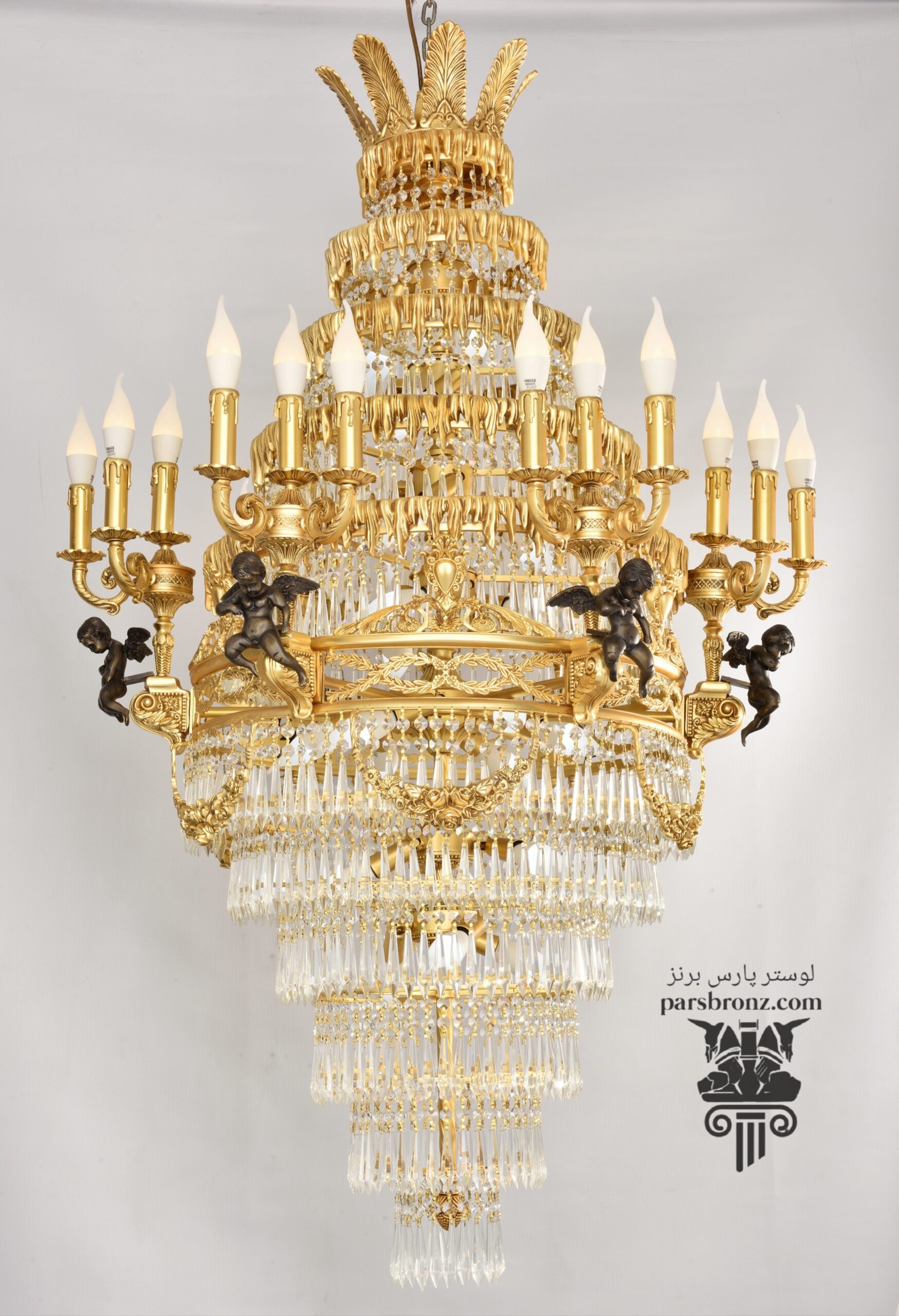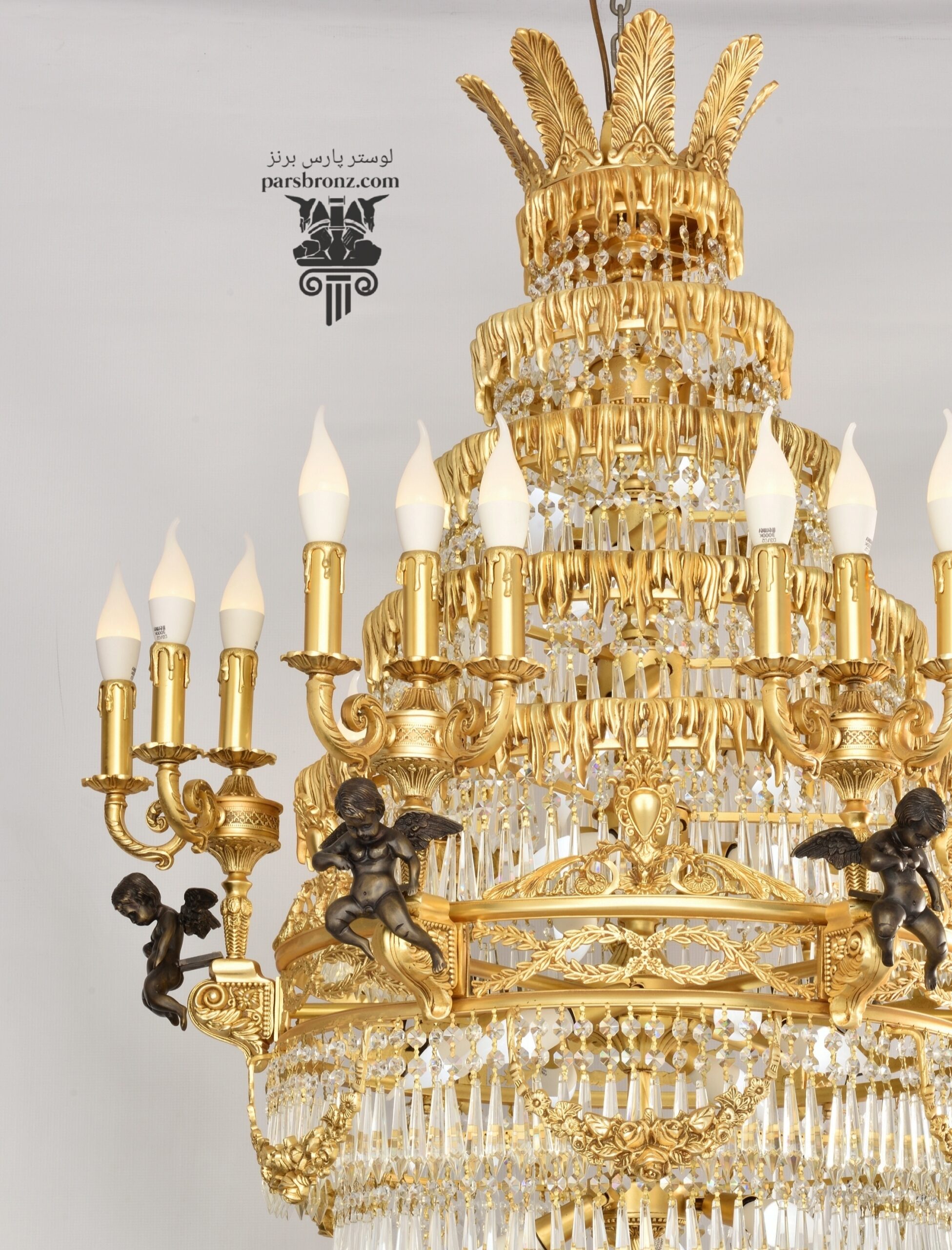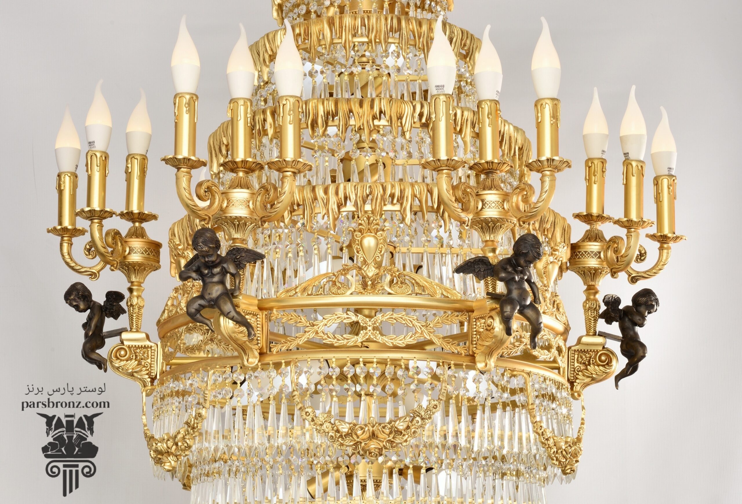 لوستر آبشاری بهمراه مجسمه های زیبای ایتالیایی کودک فرشته های بالدار برنزی و انعکاس نور شعله ها بر فراز مشعل های سه شعله ای که حمل میکنند و درخشش خیره کننده و رقص زیبای نور آنها بر روی دریای شفاف کریستالهای آویز،در هر فضایی که قرار گیرد همچون الماسی در بین دیگر اجزای دکوراسیون شما جلو گر میشود.