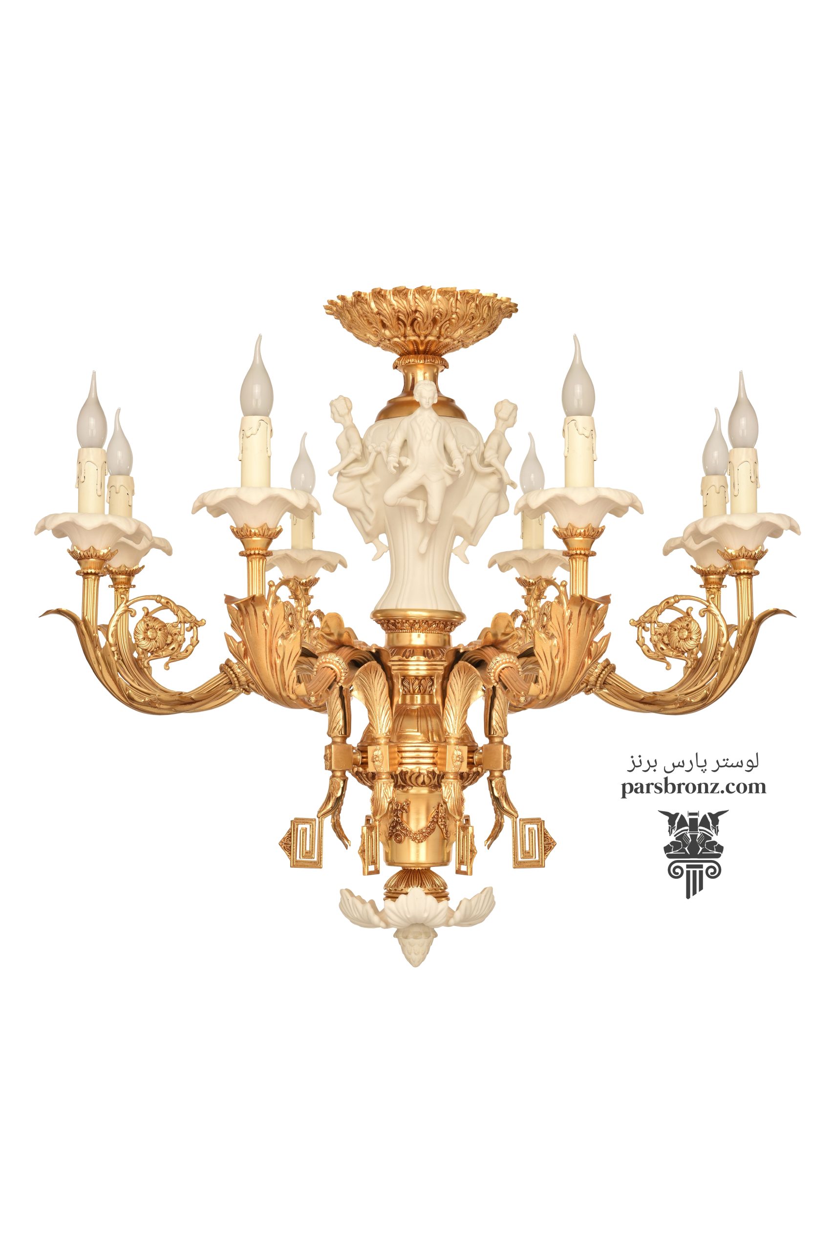 لوستر جدید فانتزی پذیرایی برنزی سرامیکی سبک کلاسیک مدرن پارس برنز کد CH-2011 محصول شرکت پارس برنز تهرلن است که با قیمت منایب ویژه کارخانه به صورت آنلاین و حضوری عرضه میگردد. این لوستر شیک و زیبا دارای 8 شاخه برنز و 8 شعله با کاپ های طرح گل نسترن سرامیکی سفید و غلاف های بلند برنجی است. این لوستر همچون دیگر تولیدات کارخانه پارس برنز دست ساز بوده و در قسمت میانی با یک مجسمه سرامیکی سفید تندیس چند زن و مرد با سبک کلاسیک اروپایی تزیین شده است. این لوستر مناسب اتاق خواب، پذیرایی، آشپزخانه، بالای میز ناهارخوری، روی جزیره و اپن آشپزخانه و… میباشد.
