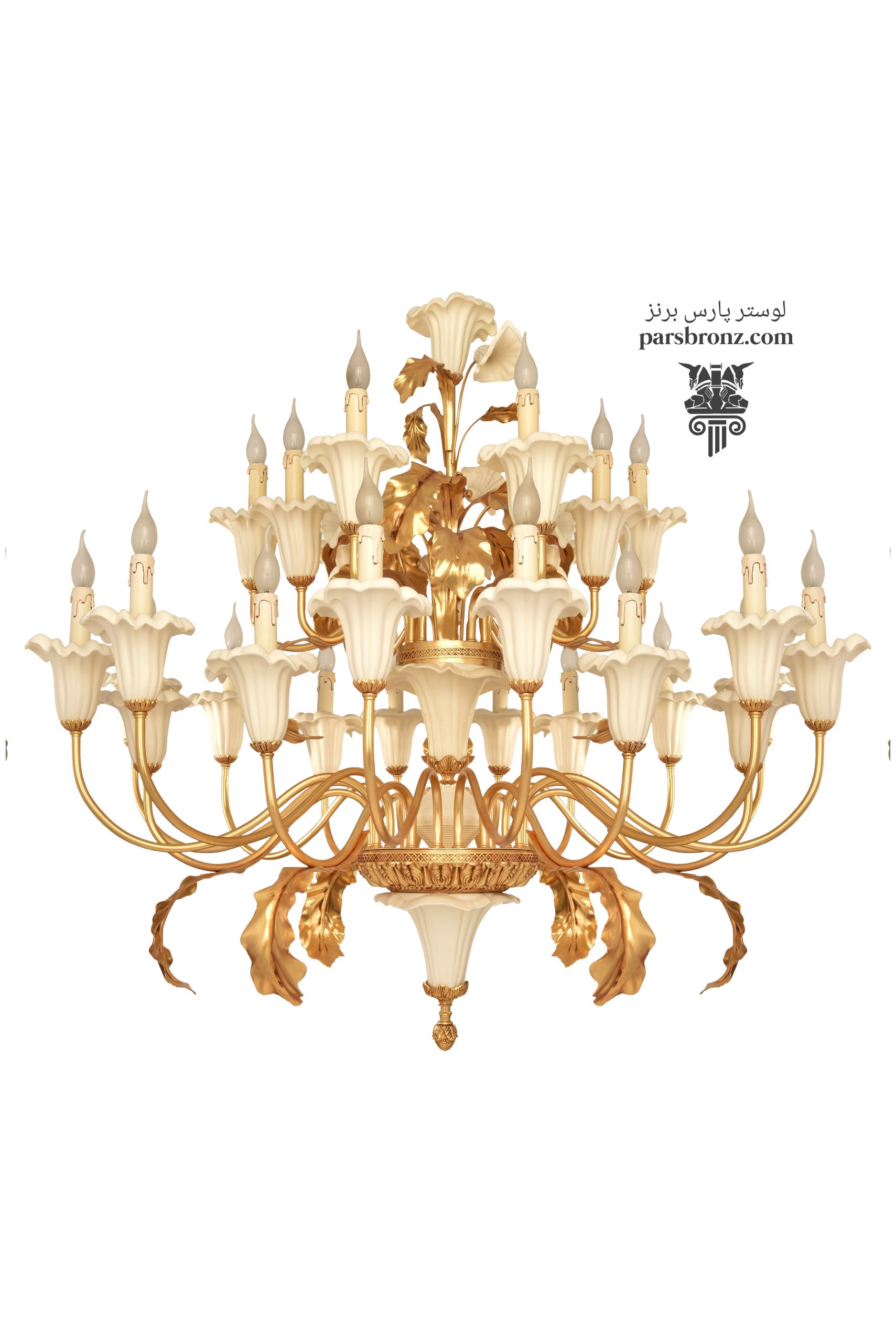 لوستر برنز سرامیکی فانتزی سفید گلایل 27 شاخه کد CH-2030, یک لوستر لوکس چشمگیر و بسیار زیبای برنزی سه طبقه است که با قیمت مناسب کارخانه پارس برنز تهران به صورت سفارشی ساز طراحی و تولید گردیده و به صورت آنلاین و حضوری عرضه میگردد. در ساختار این لوستر گلایل های سرامیکی سفید که عنوان کاپ های زنبق و پایه غلاف ها به کار رفته اند، و سپس لوستر با برگ های بزرگ و زیبای برنجی تزیین شده است. مدل های مختلف لوستر گلایل کاملا دست ساز بوده و مناسب برای  فضاهای بزرگ و لوکس، سالن پذیرایی، اتاق خواب و آشپزخانه و لابی میباشد.