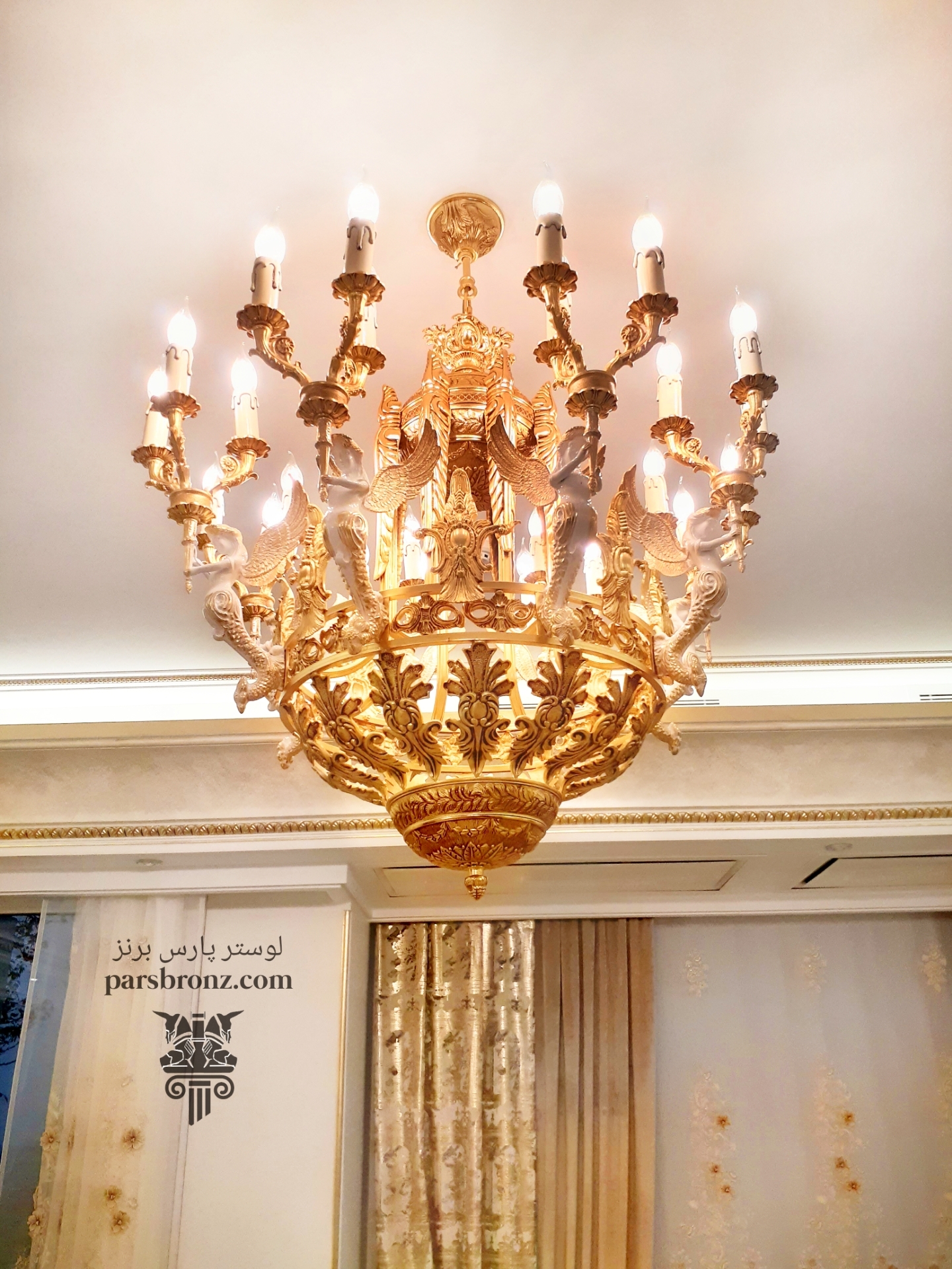یک نمونه لوستر امپریال سلطنتی بزرگ سفارشی با ۲۰ مجسمه برنزی فرشته بالدار سه شعله را مشاهده میفرمایید.
