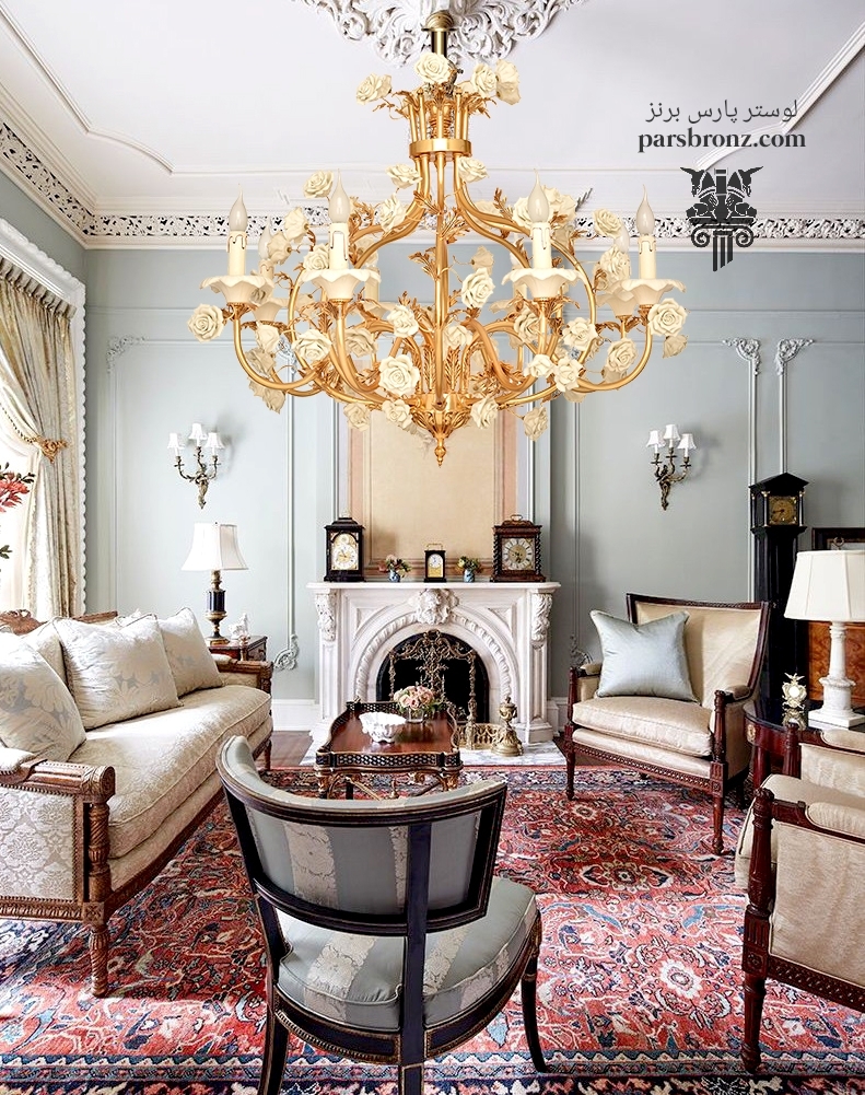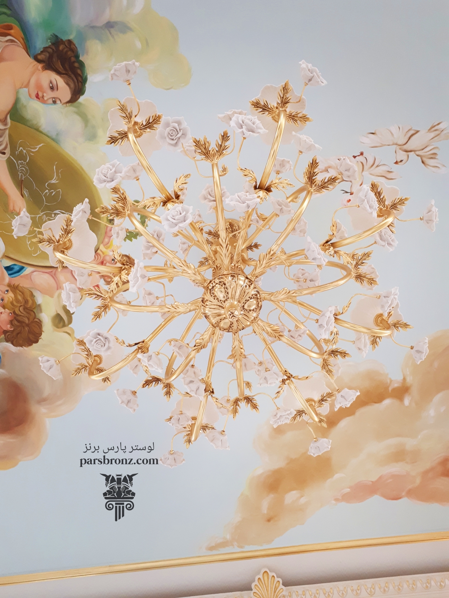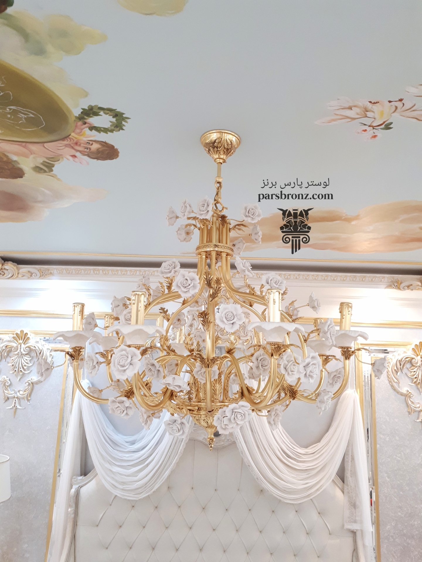 لوستر فانتزی سفید پذیرایی برنز (برنجی با کیفیت و عیار ممتاز) کد CH-2033 دارای هشت شاخه و هشت شعله بوده و یکی از طرح های جدید مجموعه ترکیب برنزی_سرامیکی شرکت پارس برنز است که با قیمت کارخانه و ضمانت محصول به صورت انلاین و حضوری و به صورت سفارشی ساز با امکان تغییر جزییات محصول عرضه میگردد. این لوستر شیک لاکچری زیبا مناسب برای اتاق خواب آشپزخانه و پذیرایی، بالای میز نهارخوری و جزیره آشپزخانه است. شاخه ها و بدنه برنزی لوستر دست ساز و حاصل خم کاری، قالب ریزی و پرداخت صنعتگران هنرمند خبره و ماهر مجموعه پارس برنز تهران میباشد. گل های رز سفید سرامیکی توسط میله و پیج های برنجی به گرداگرد بدنه لوستر و شاخه های پیرامونی جوش داده میشود و محصول پس از پرداخت نهایی و آبکاری و انجام فینیشینگ نهایی و انجام تست کیفیت آماده عرضه میگردد.