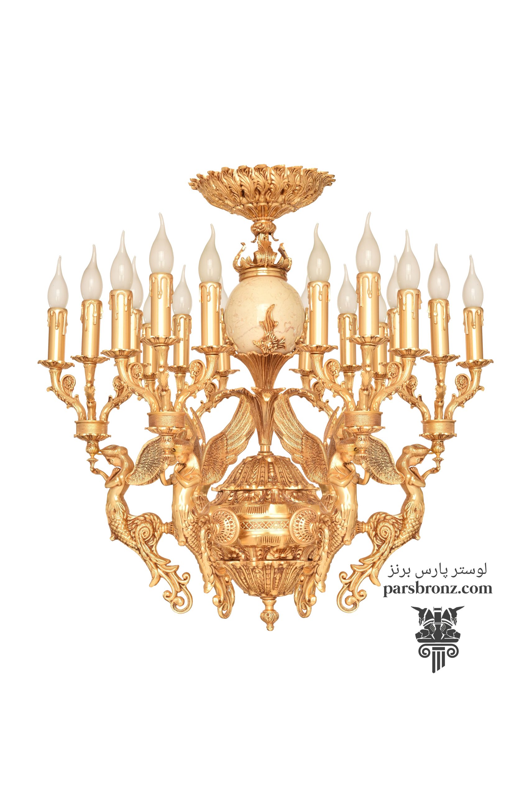 لوستر پذیرایی برنزی (برنجی با کیفیت و عیار ممتاز) جدید با تزیین گوی سنگ مرمر سفید یک لوستر کلاسیک از برند پارس برنز کد CH-3013 است که با قیمت خرید مناسب ویژه کارخانه به صورت آنلاین و حضوری عرضه میگردد. لوستر کلاسیک کد ۳۰۱۳ دارای شش مجسمه فرشته بالدار دست ساز برنزی و 18 شعله است (هر فرشته برنزی یک مشعل با سه شعله را حمل میکند). این لوستر زیبا دارای کیفیت بسیار بالای ساخت و آبکاری بادوام طلائی فورتیک و یک پوشش محافظ نهایی برای فینیشینگ بوده؛ و مناسب برای پذیرایی، اتاق خواب مستر و آشپزخانه است. لوستر لاینر خطی طرح فرشته ، محصولی دیگر از مجموعه لوستر کلاسیک طرح فرشته است که بهمراه این لوستر برنجی برای بالای میز ناهارخوری و جزیره آشپزخانه قابل سفارش میباشد.