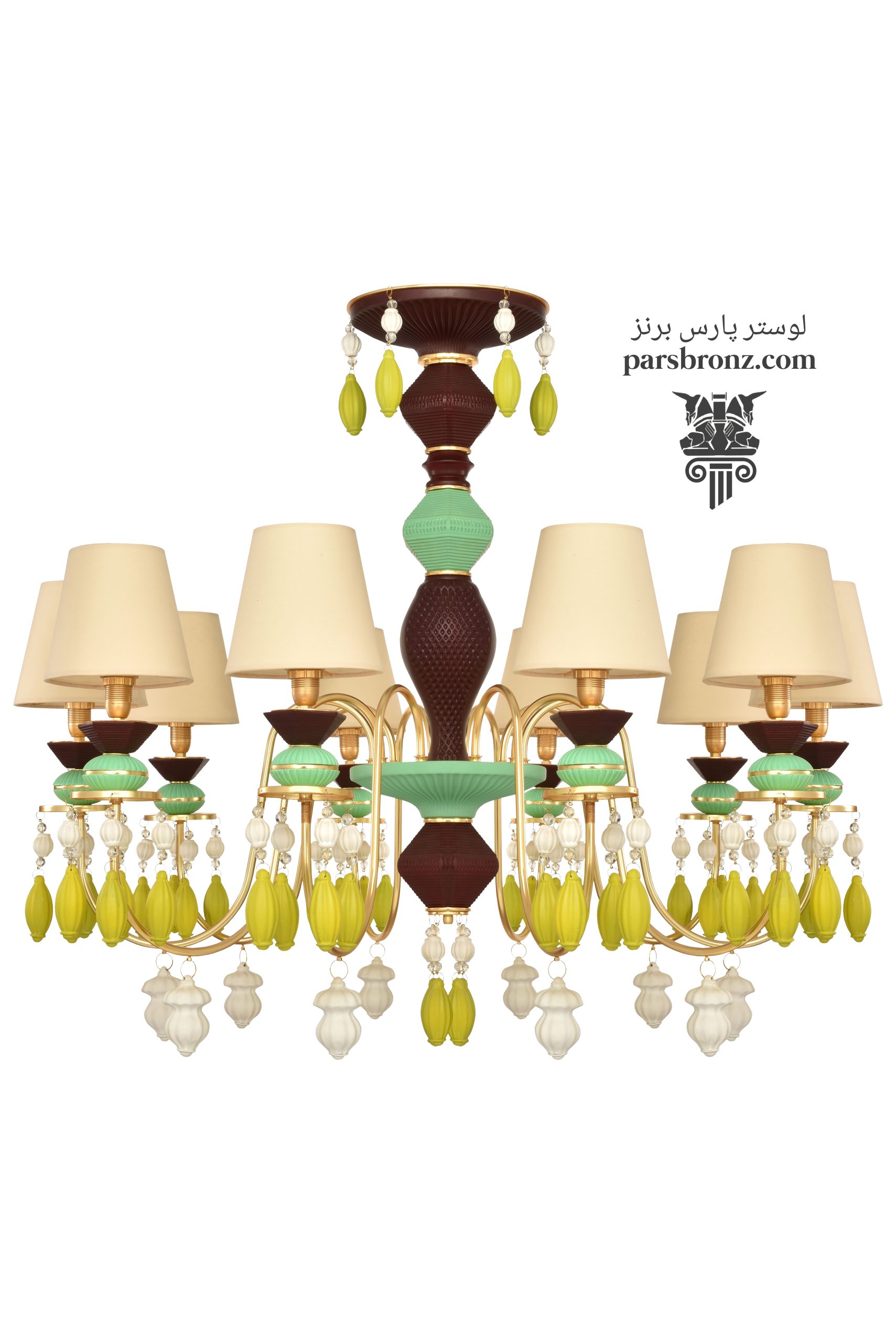 لوستر جدید و زیبای سفید برنزی _ سرامیکی مدرن پارس برنز کد CH-2027 یک لوستر 10 شاخه و 10 شعله جدید با شیدهای کوچک و مهره های رنگی سرامیک با شاخه ها و بدنه برنز (برنج با کیفیت و عیار ممتاز) است. این لوستر اسپرت مدرن محصول شرکت پارس برنز تهران است که با قیمت ویژه کارخانه به صورت آنلاین و حضوری عرضه میگردد. امکان سفارشی سازی تعداد شاخه ها از 6 تا 16 شاخه برنجی در یک طبقه و تنوع بالای طیف رنگی قسمت های سرامیکی و شید لوستر فراهم میباشد. ملیکای 10 شاخه برای پذیرایی اتاق خواب و آشپزخانه مناسب میباشد. این لوستر کاملا دست ساز است.