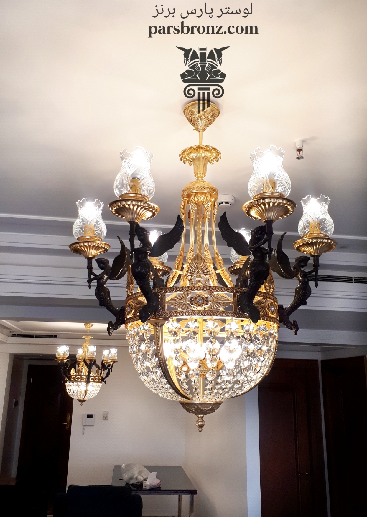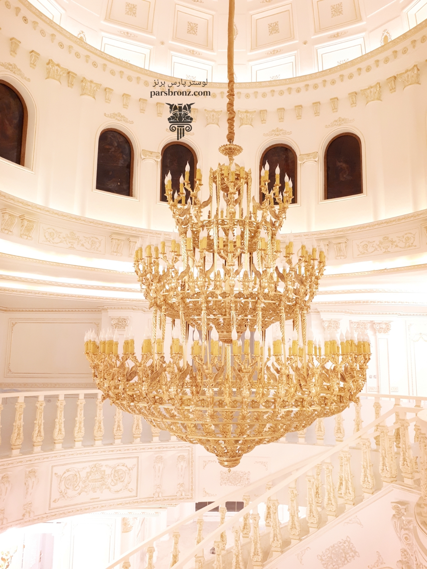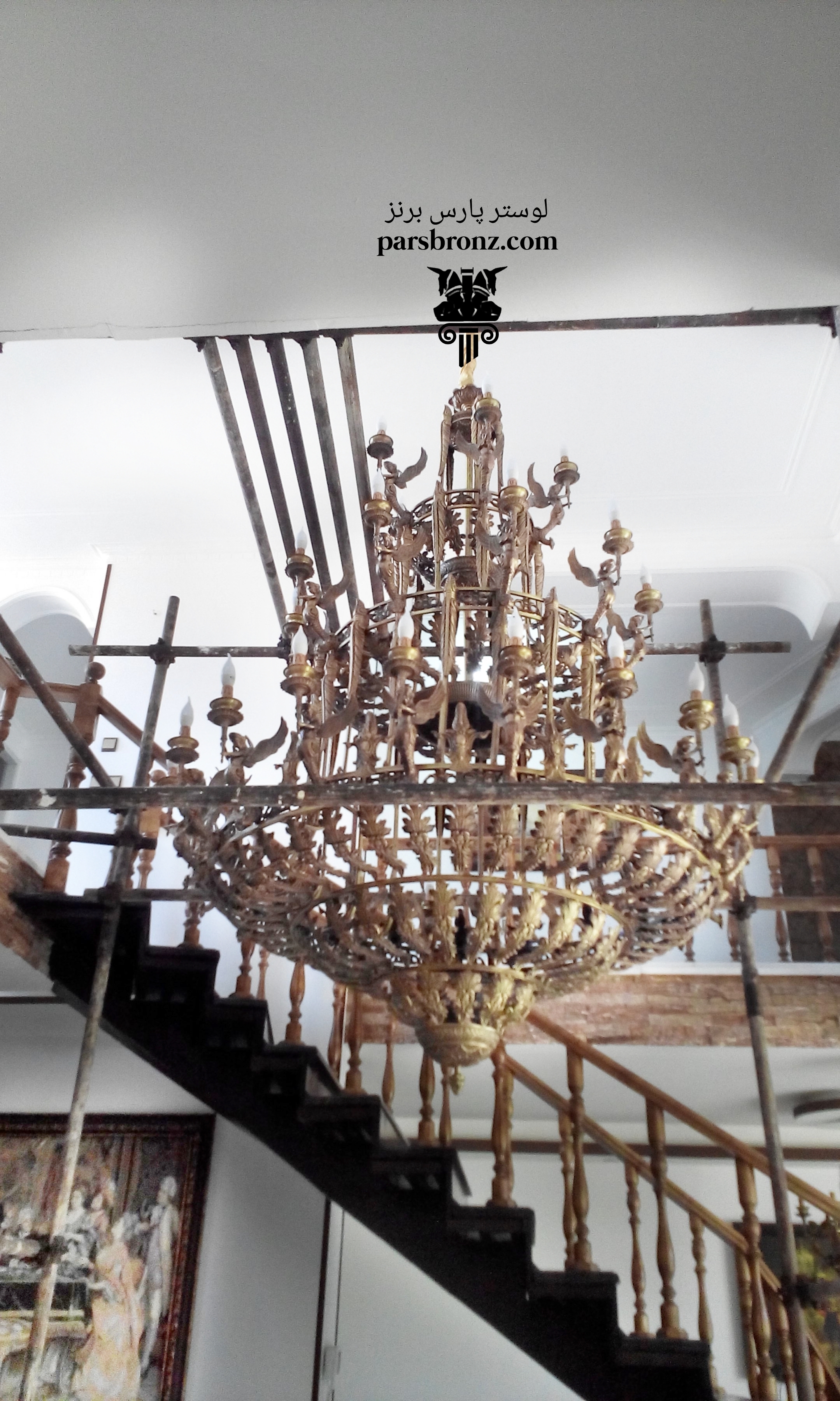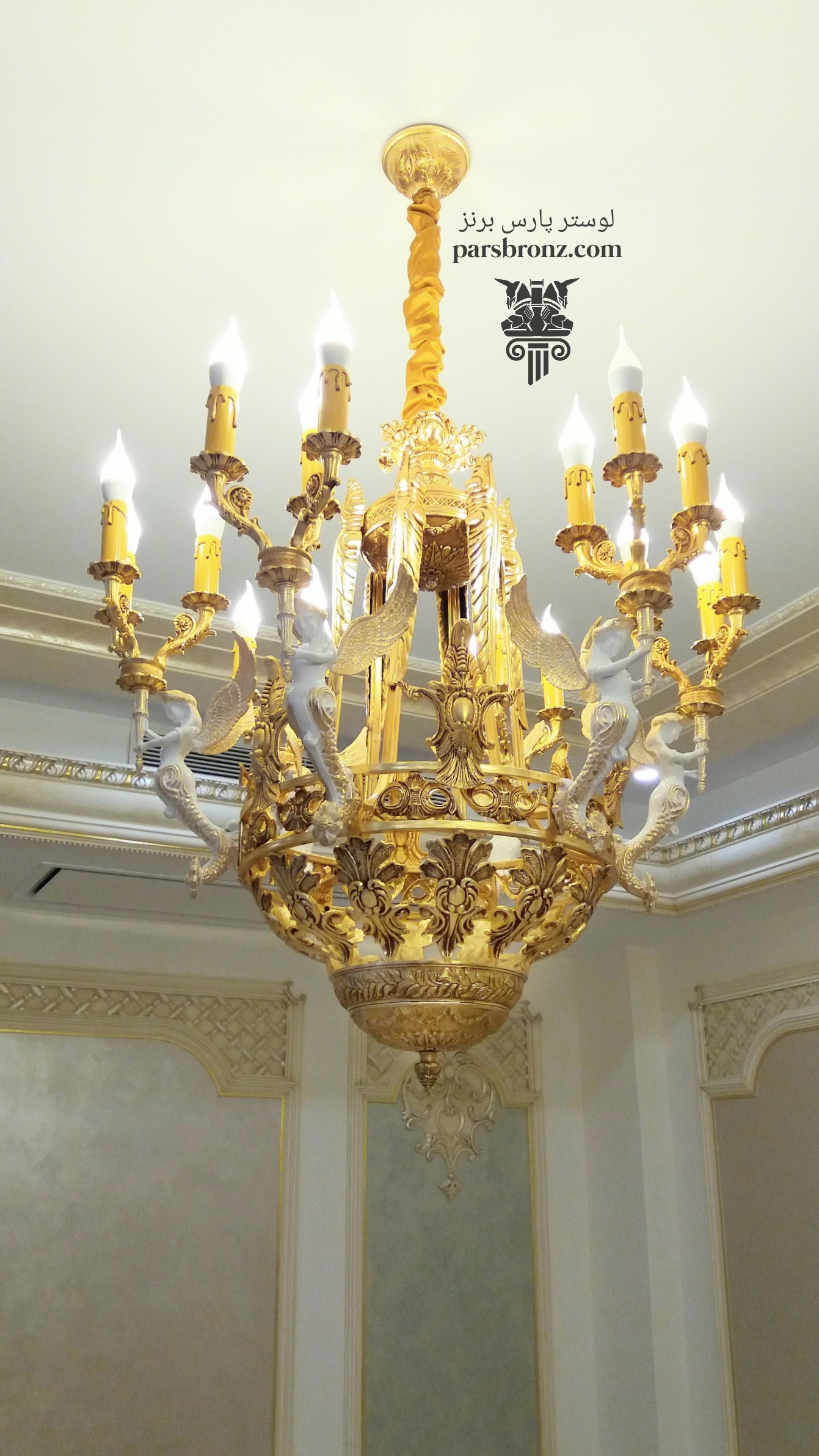 یک نمونه بزرگ سفارشی لوکس و مجلل لوستر امپریال را که به سفارش مشتری عزیز شرکت پارس برنز تهران برای فضای بزرگ و بلند سقف سالن دوبلکس ساختمان ساخته شد مشاهده میفرمایید. با توجه به بزرگی سالن و ارتفاع زیاد لوستر و سقف و نیاز به نوردهی بیشتر، مشعل های سه شعله بر روی فرشته ها نصب گردید.