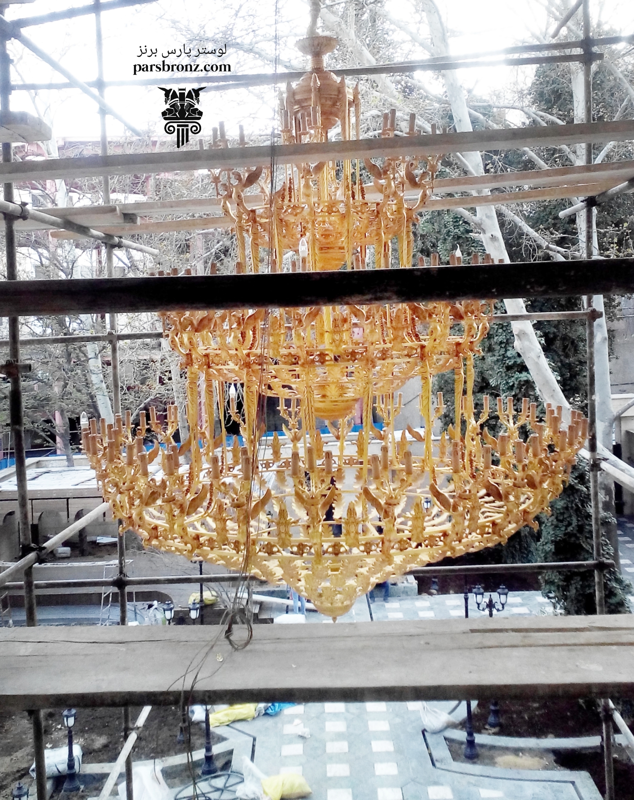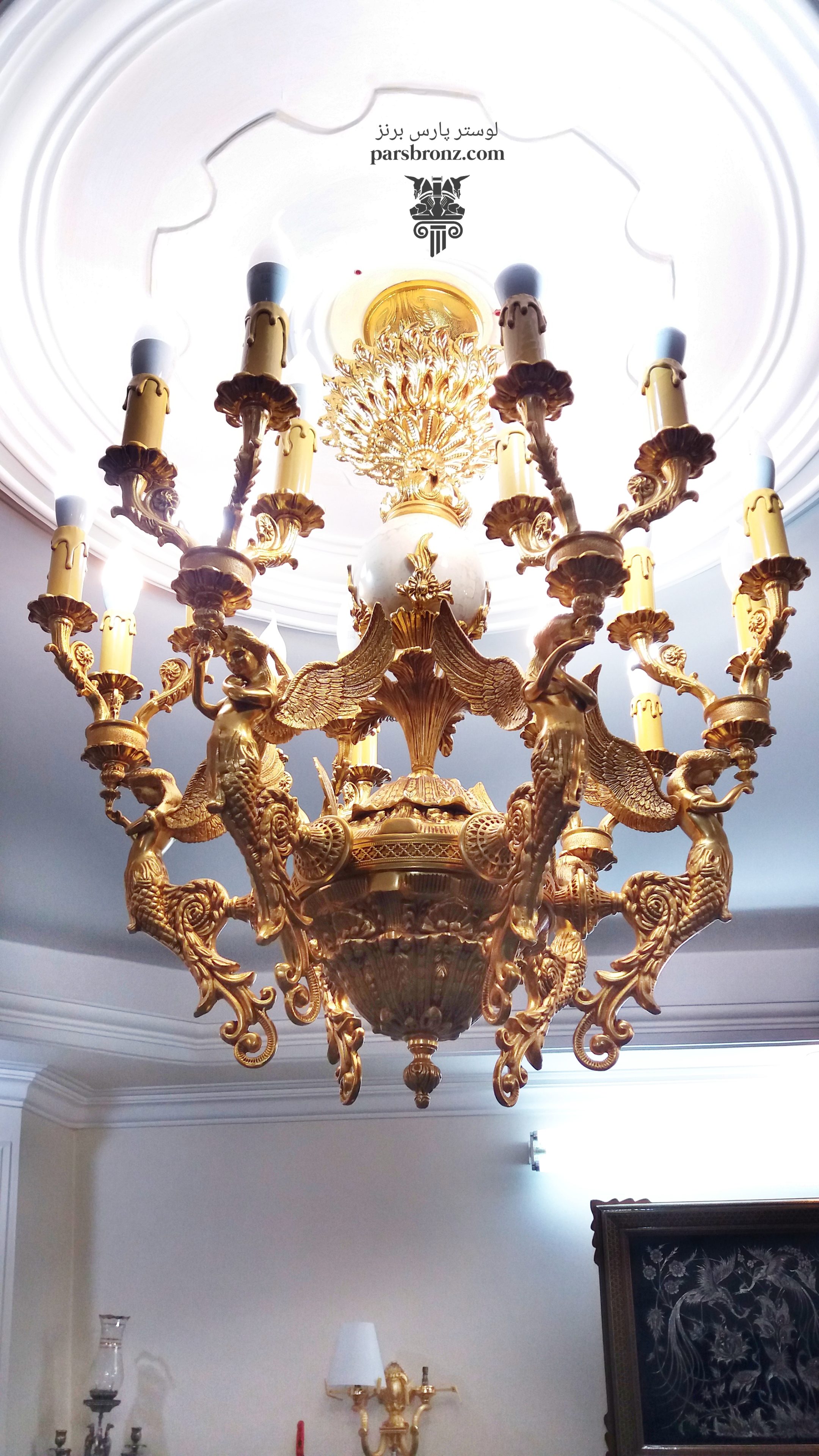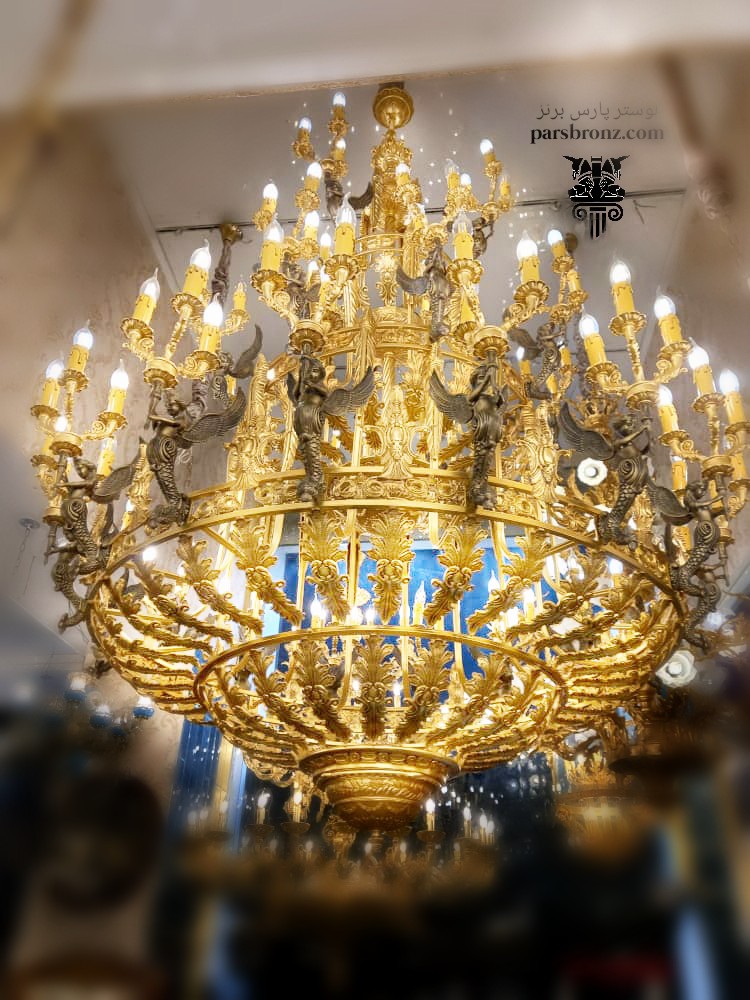 یک نمونه بزرگ سفارشی لوکس و مجلل لوستر امپریال را که به سفارش مشتری عزیز شرکت پارس برنز تهران برای فضای بزرگ و بلند سقف سالن دوبلکس ساختمان ساخته شد مشاهده میفرمایید. با توجه به بزرگی سالن و ارتفاع زیاد لوستر و سقف و نیاز به نوردهی بیشتر، مشعل های سه شعله بر روی فرشته ها نصب گردید.