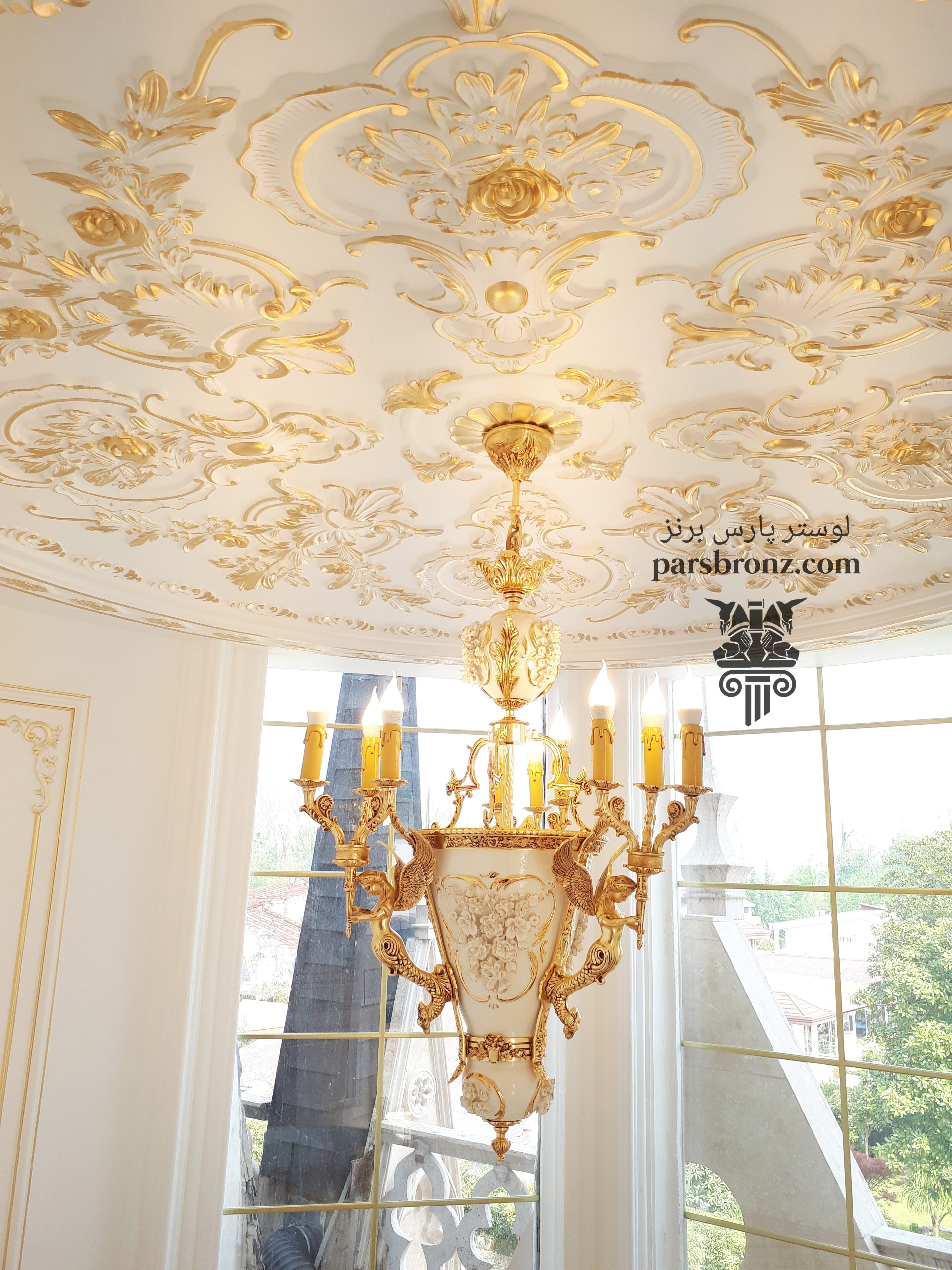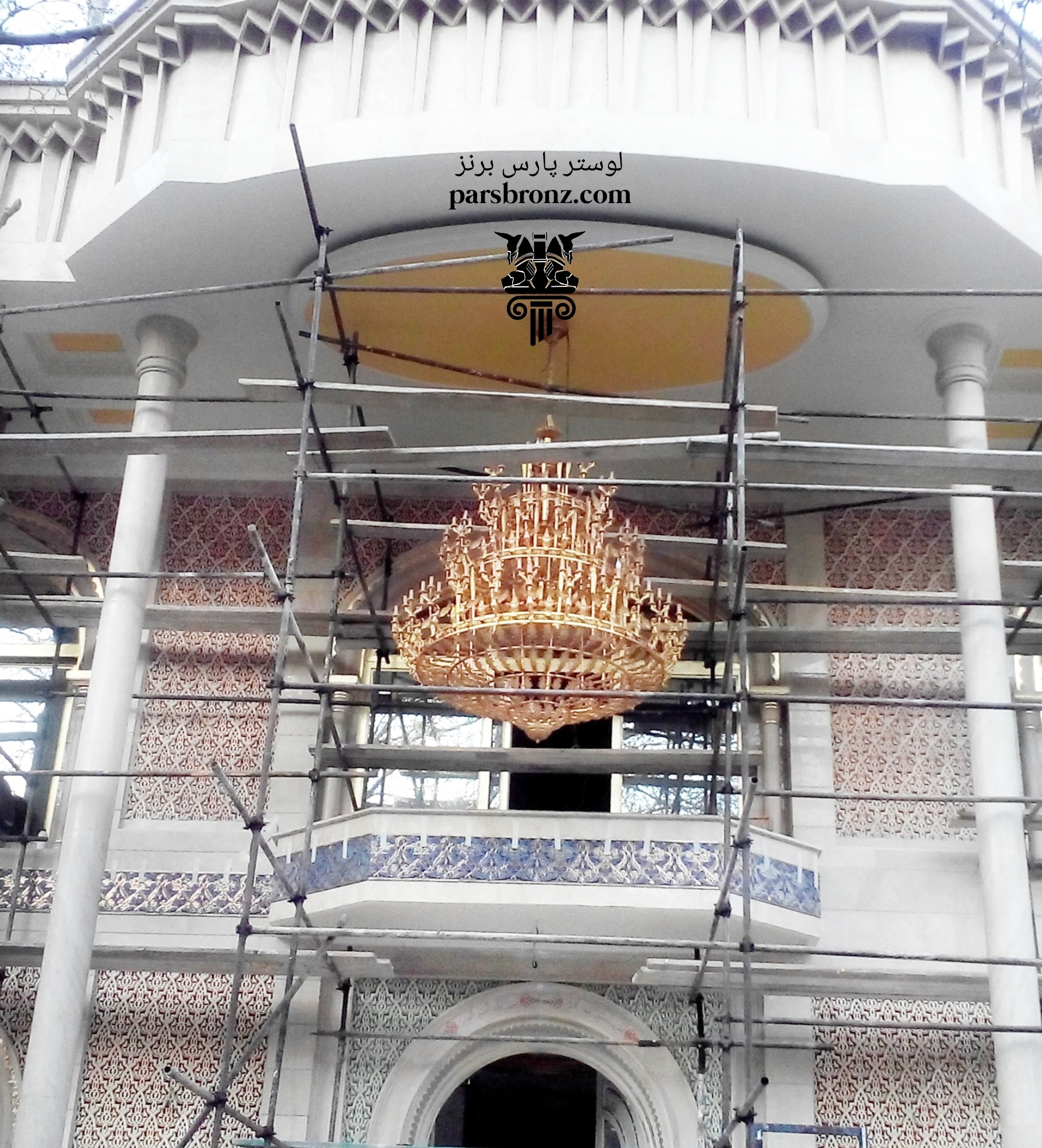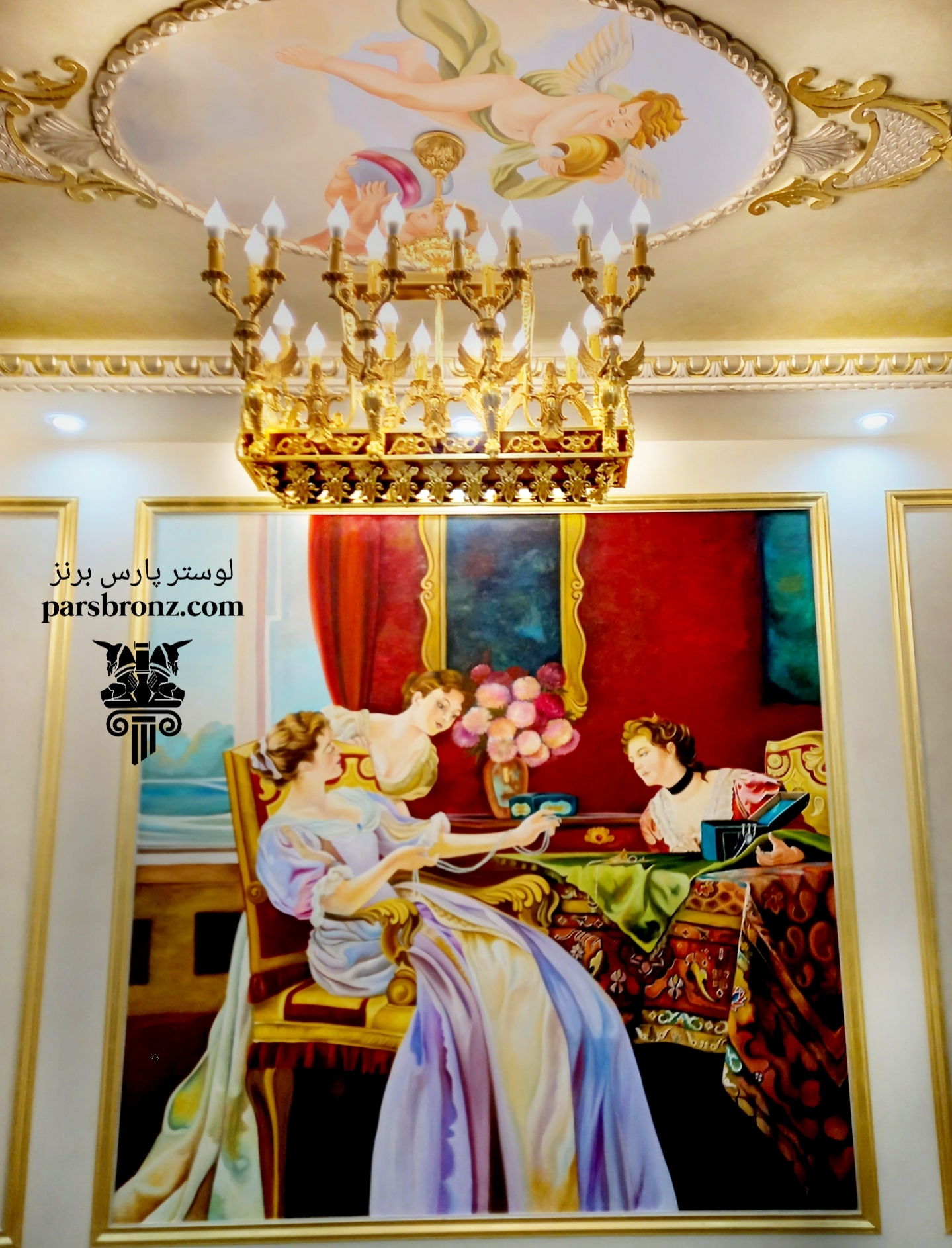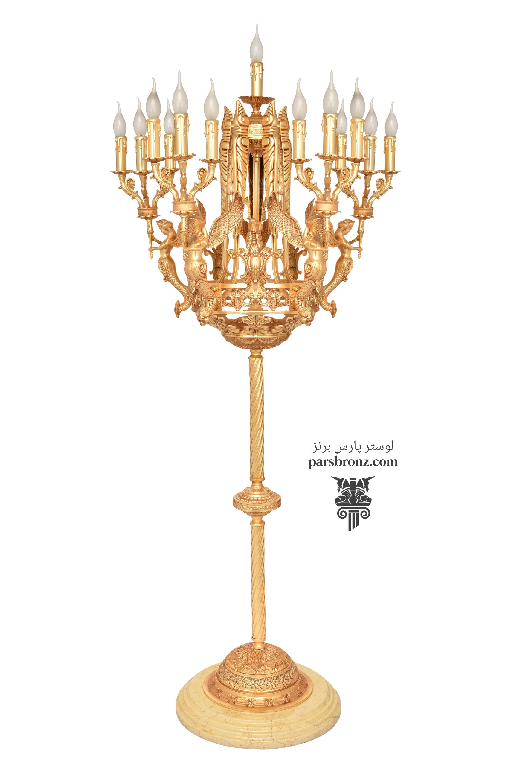 یک نمونه بزرگ سفارشی لوکس و مجلل لوستر امپریال را که به سفارش مشتری عزیز شرکت پارس برنز تهران برای فضای بزرگ و بلند سقف سالن دوبلکس ساختمان ساخته شد مشاهده میفرمایید. با توجه به بزرگی سالن و ارتفاع زیاد لوستر و سقف و نیاز به نوردهی بیشتر، مشعل های سه شعله بر روی فرشته ها نصب گردید.
