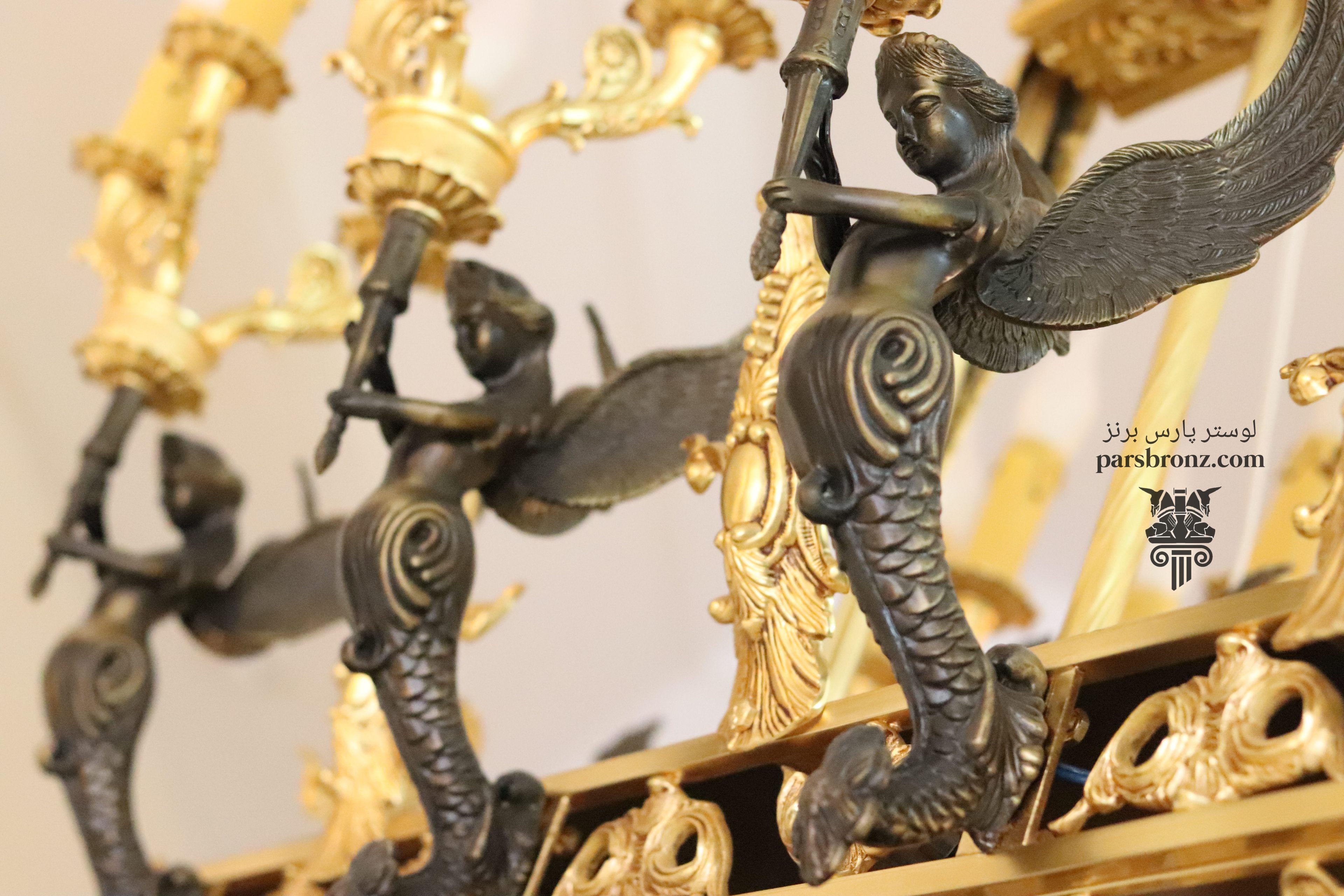 در تصویر زیر بدنه لوستر به رنگ طلایی و فرشته ها با رنگ فورتیک آنتیک برنزی آبکاری شده است.