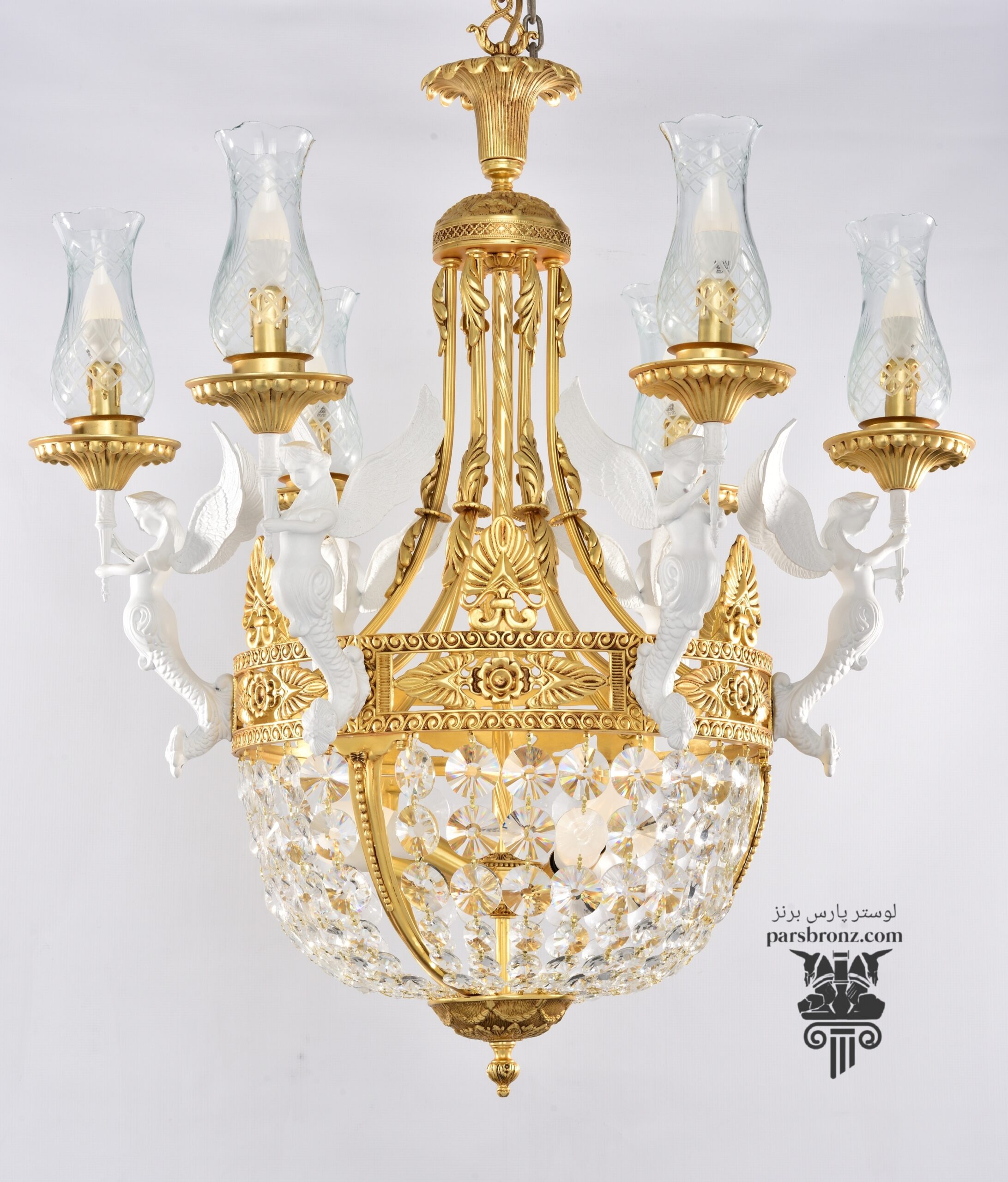 لوستر کوچک کریستالی برنز زیبا و فانتزی جدید شرکت پارس برنز، مدل فرشته امپریال، تجلی کامل و باشکوهی از هنر اصیل کلاسیک در طراحی و تولید لوستر است. لوستر امپریال به صورت کاملا دست ساز و سفارشی ساخت توسط صنعتگران ماهر پارس برنز تهران تولید و با ضمانت آبکاری و قیمت کارخانه تقدیم شما میگردد. ابعاد و تعداد شاخه های این لوستر لوکس کلاسیک را میتوانید با توجه به فضای خود سفارشی سازی نمایید. این لوستر مناسب نصب در پذیرایی کوچک آشپزخانه و اتاق خواب و راهرو میباشد. این لوستر دارای ۶ فرشته بالدار برنزی است که هر یک از آنها مشعلی تک شعله و حبابدار را حمل مینماید.